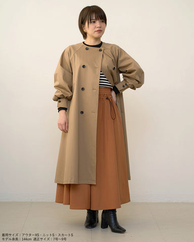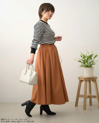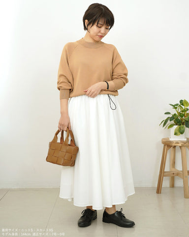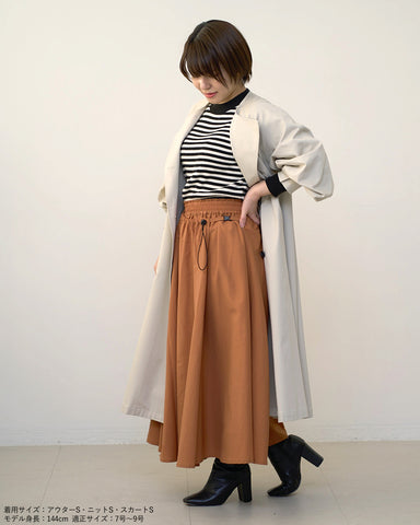 (S/画像)Sはウエストが少し下がってきますが、内側の紐をキツめに絞るとウエスト位置がちょうどよく着用できました。ドロストデザインのおかげで目線が散り、たっぷりギャザーなのに着ぶくれして見えません。