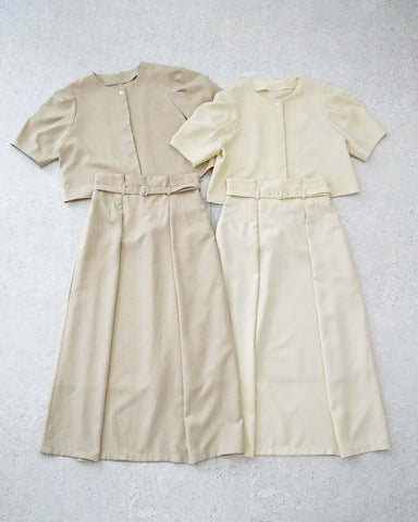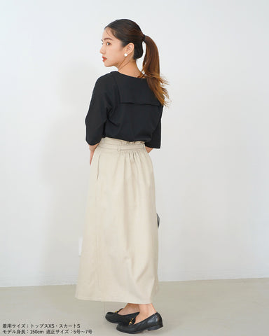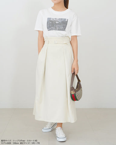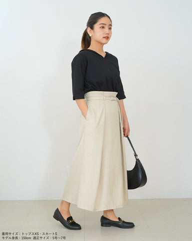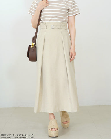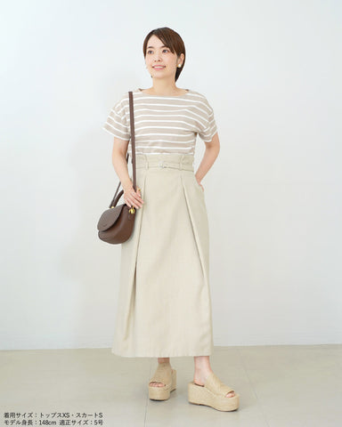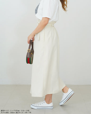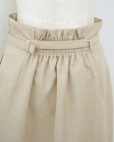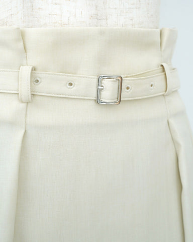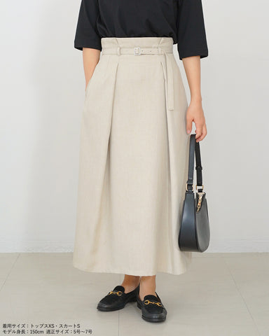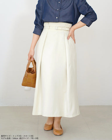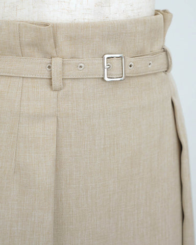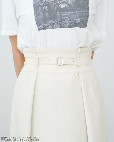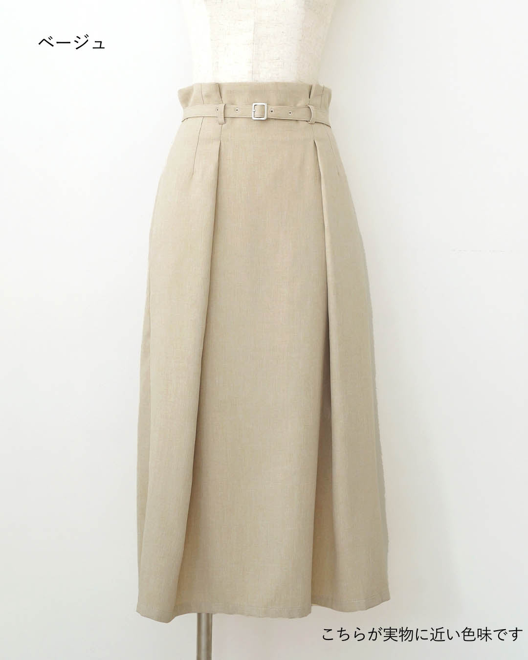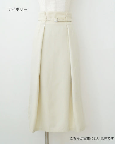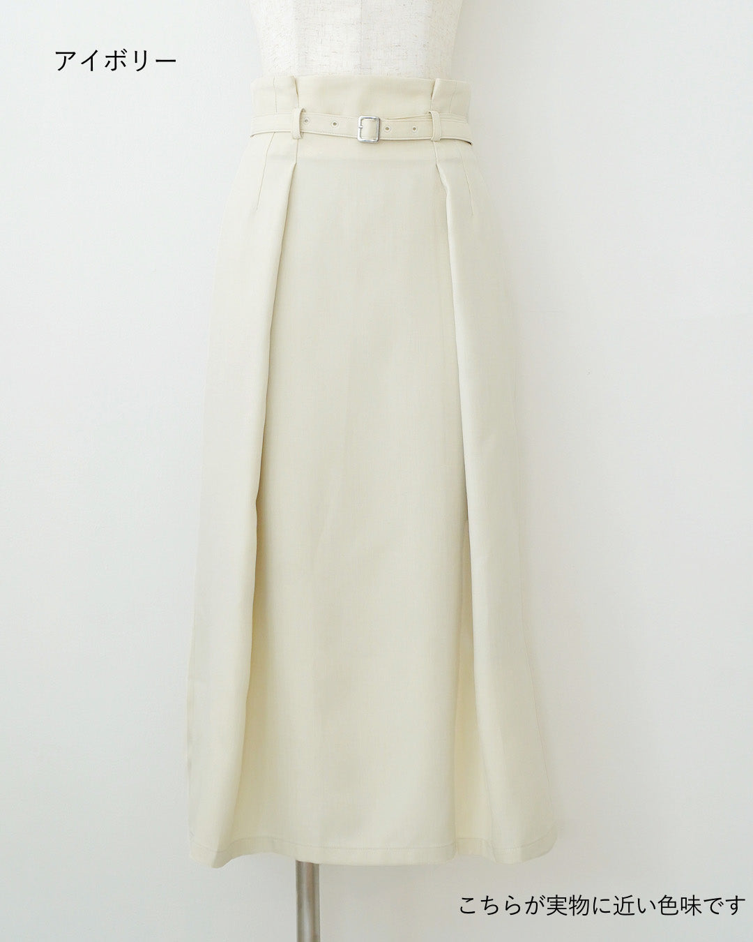 タックデザインを入れ、細めのベルトを施し立体感をプラス。トレンド感あふれながらも、落ち着いた印象のスカートです。