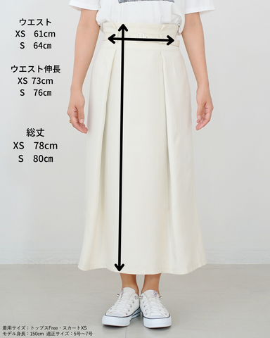 (S/右)ウエストにゆとりが出ます。丈は落ち感もあり足首ジャストになりましたが、ベルトが付いておりますので、ウエストのゆとりはカバーできました。足首丈でも、タックによりしなやかなスカートの揺れが丈の長さを感じさせません。