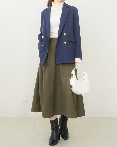 長すぎないミディアム丈なので、ショートブーツ、ロングブーツのどちらにも合わせやすい丈感にいたしました。