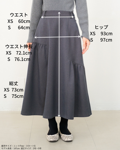 (XS/左)ウエスト部分にはゴムが入っているのでそこまでキツくはないですが、厚手のニットをインするのは難しそうです。着丈は膝がしっかりと隠れる膝下4~5cmで、動いても膝は見えません。147のスカートの中では短めの丈でデザインも素敵で履き心地も軽くて楽なスカートです。