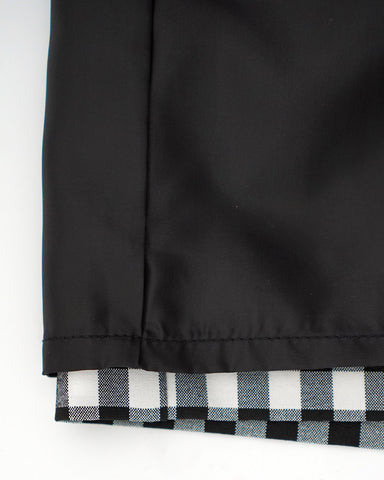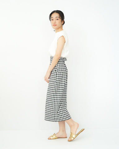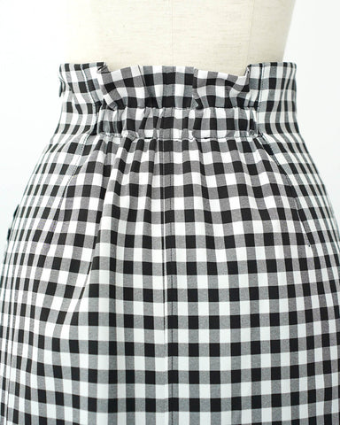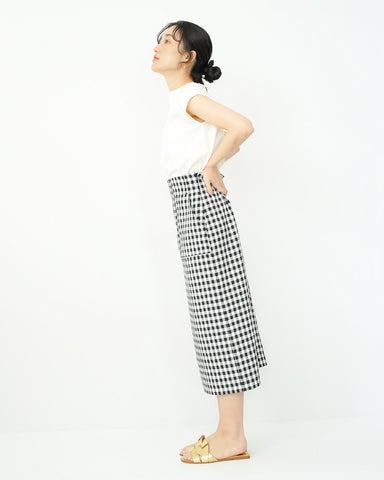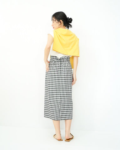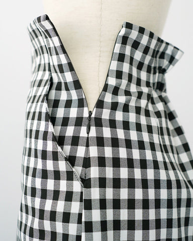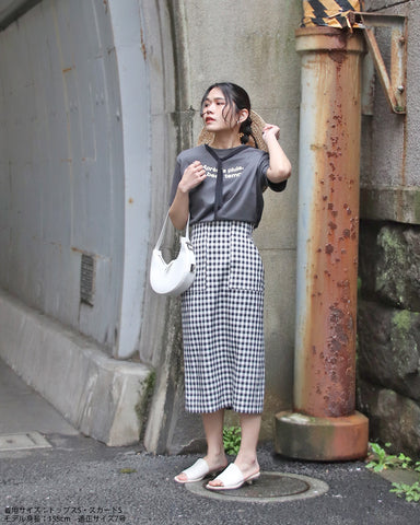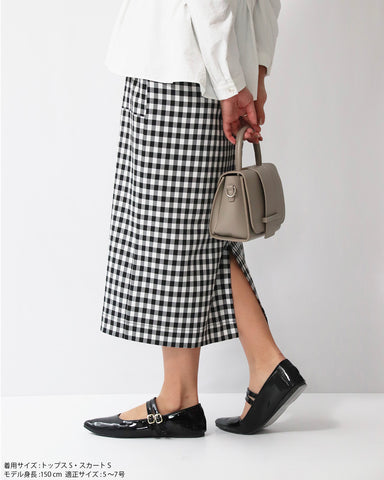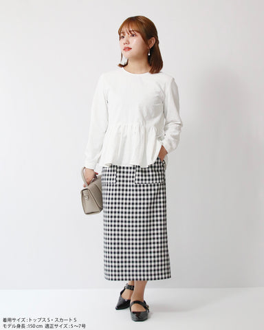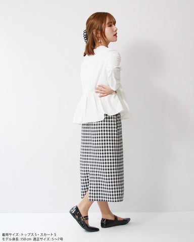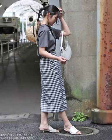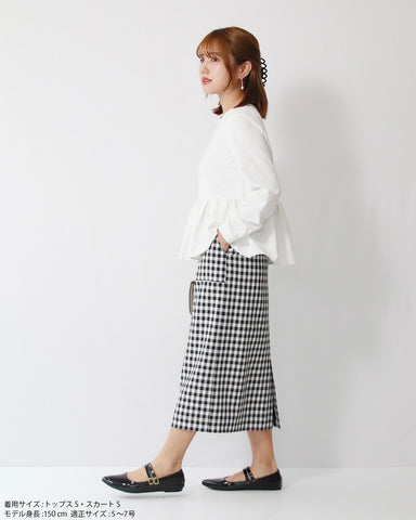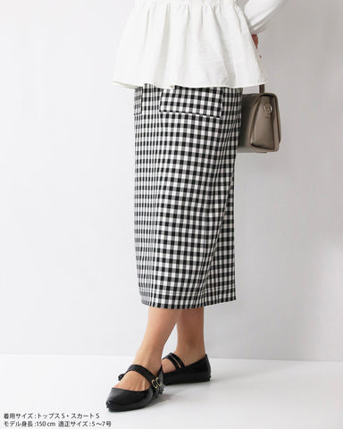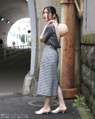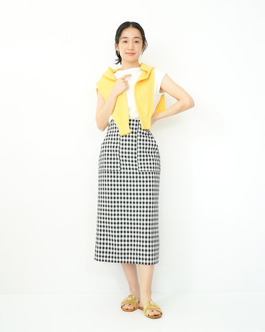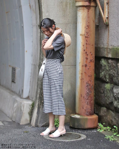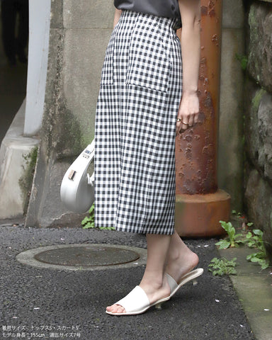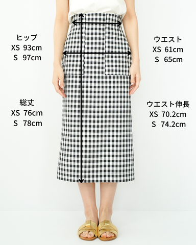 (XS/左)ウエストジャストサイズです。すっきりとしたIラインですが、バックはキツすぎないゴムになっており、少し大きめのギンガムチェックが気になる下腹、ヒップを誤魔化してくれます。割と薄手の生地ですが、ヒップラインを拾いにくく、丈は上品なミドル丈となり、甘くなりがちなギンガムチェックですが大人も取り入れやすいです。