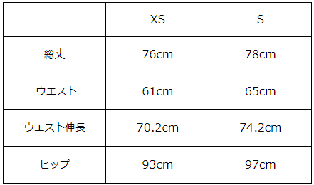 (XS/左)ウエストが気になる体型の私ですが、XSでも問題なく着用できました。着丈も短すぎることなく、ふくらはぎの中間よりやや長めのミディ丈となります。ウエストベルトが無いデザインの為、お腹の締め付け具合や下腹のポッコリ感が気にならない印象です。Sに比べてXSサイズの方がコンサバな印象になりますが、すごく印象が変わる程の差ではございません。ウエストやヒップ周りのサイズ・お好きな着心地感でお選びください。