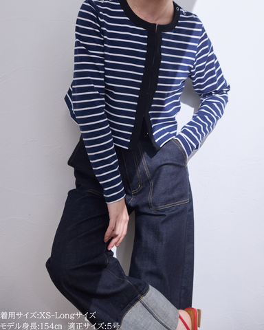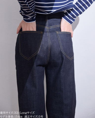 XS~SRまで、長さもShortとLongでお選びいただけるようなサイズ展開にしております。いつものサイズ感よりややフィット目にお作りしています。最初は硬い生地印象のあるデニムですが、履いているうちに馴染んでくるので、色落ちとともにお楽しみください。