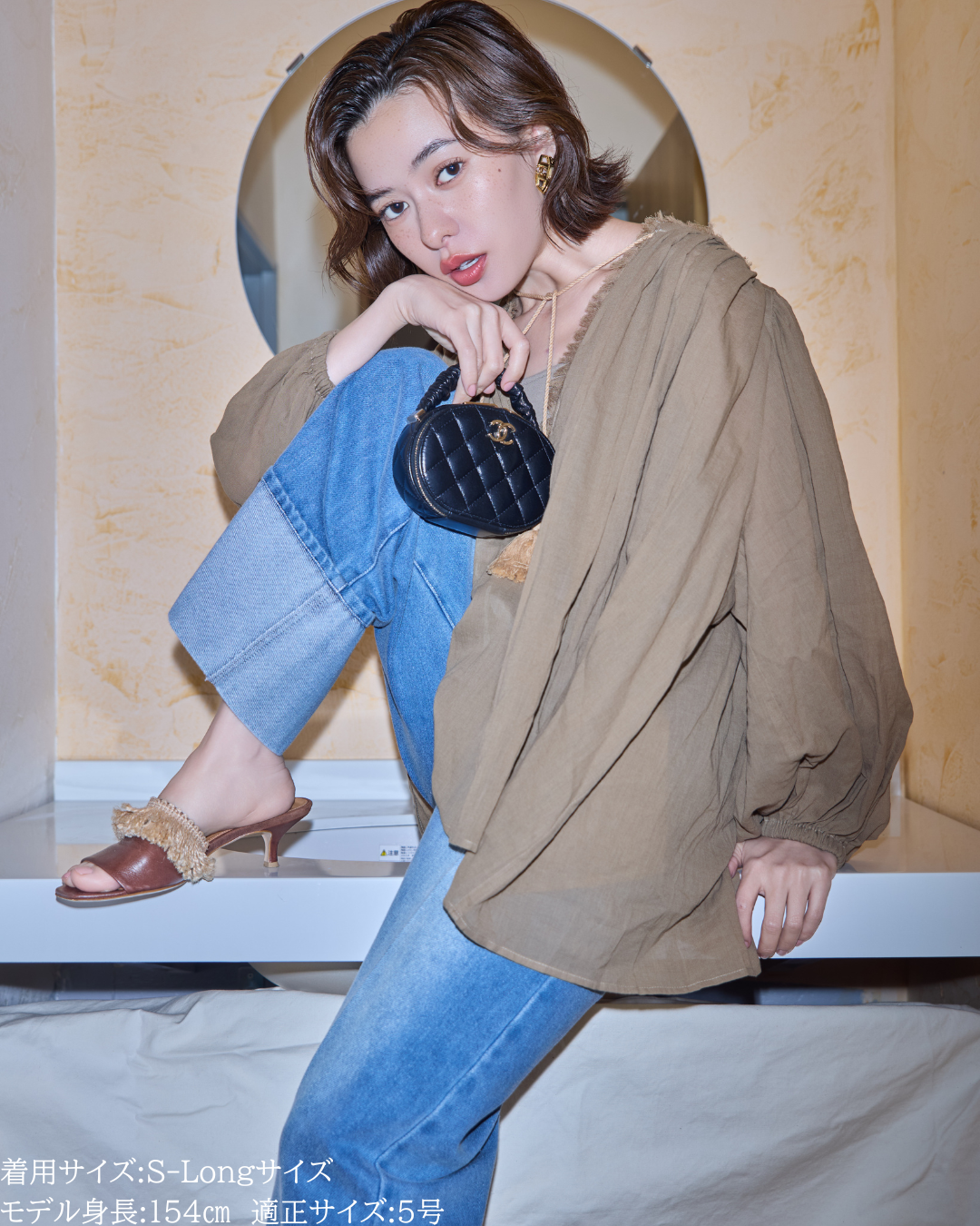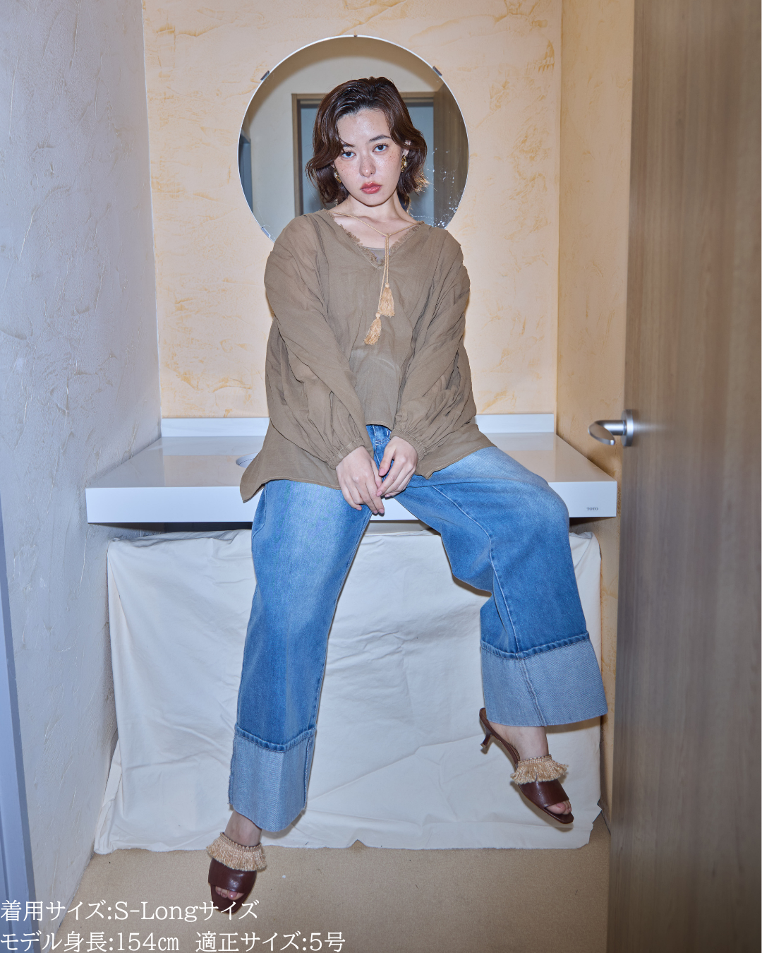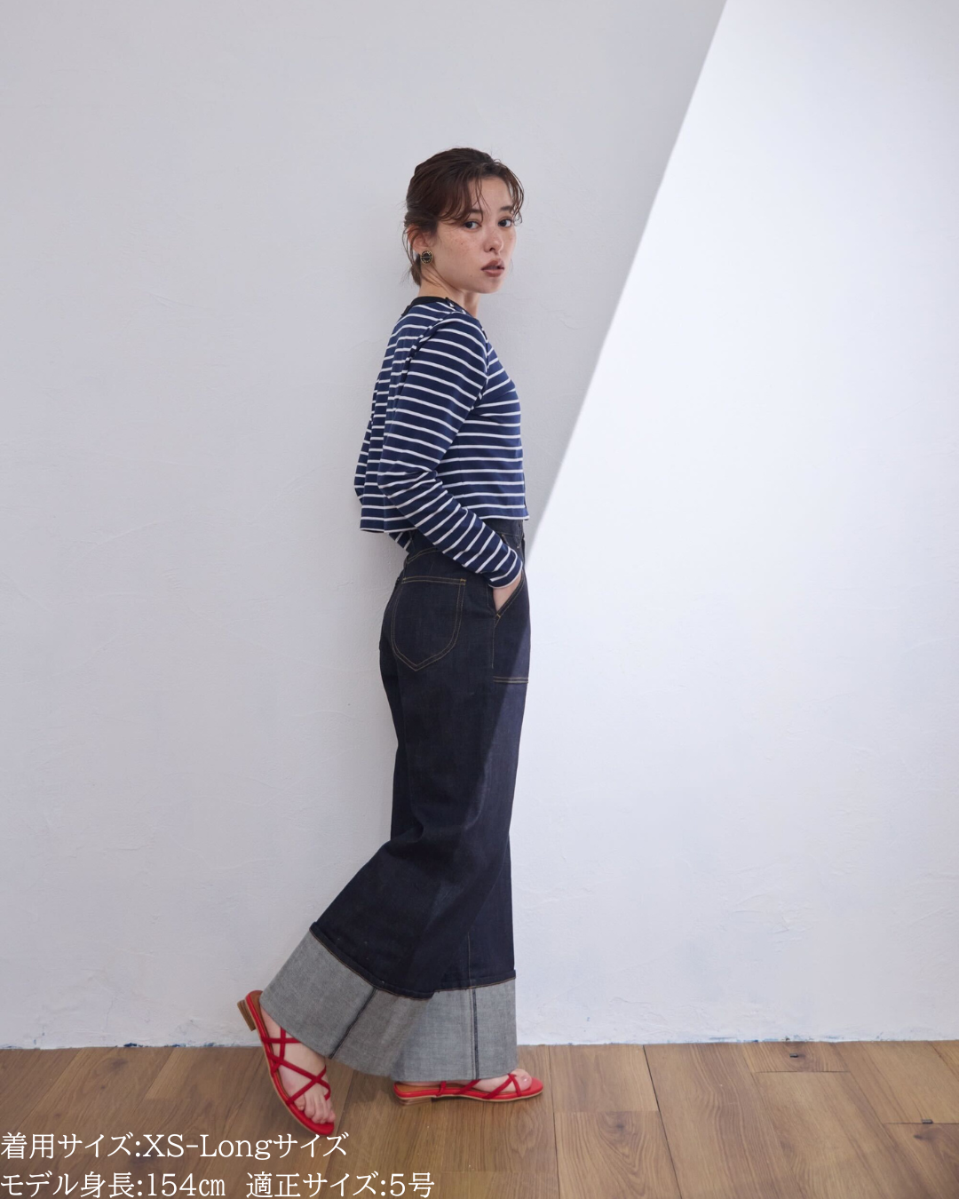 (S-Long/中右)丈はウエストの落ち感もあり、フラットシューズに合わせても床につき裾の弛みが出ます。個人的にこのデニムは弛みを出さずピンっと折り返したデニムがストンと真っ直ぐ落ちた感じが可愛いと思いますので、longを選ぶ場合はヒールで合わせます。