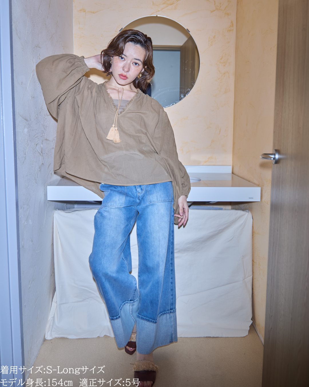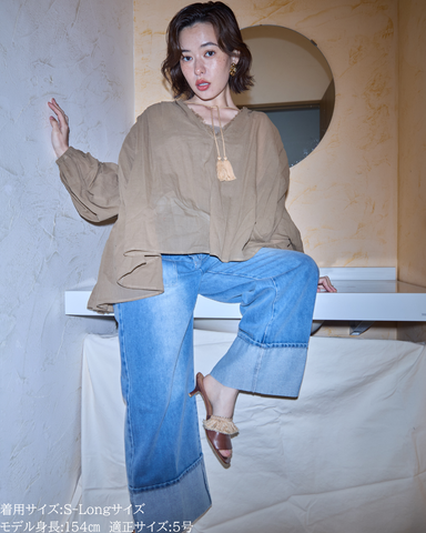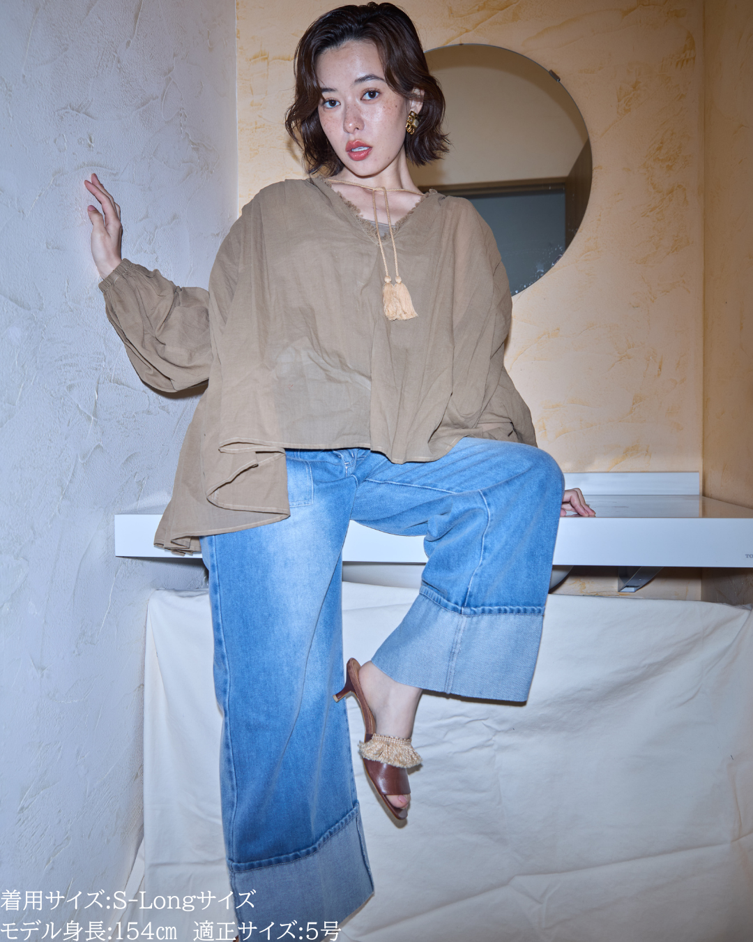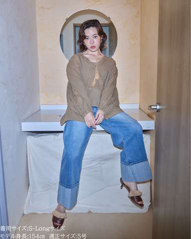 (S-Long/中右)丈はウエストの落ち感もあり、フラットシューズに合わせても床につき裾の弛みが出ます。個人的にこのデニムは弛みを出さずピンっと折り返したデニムがストンと真っ直ぐ落ちた感じが可愛いと思いますので、longを選ぶ場合はヒールで合わせます。